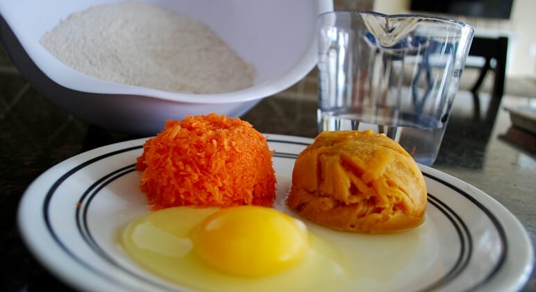 - In a large bowl, add the flour, sweet potato, carrots, egg and water.