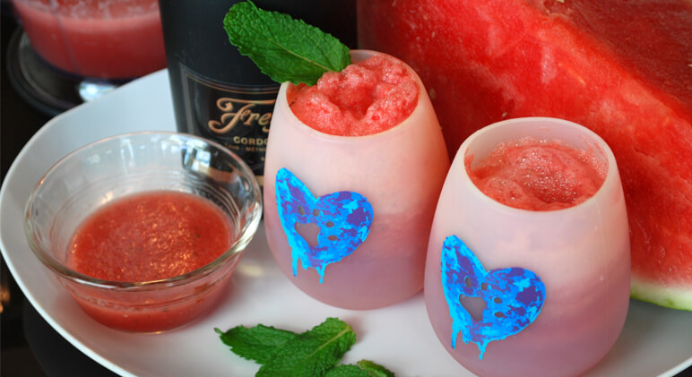 Start by blending cubed watermelon, crushed ice, and a few mint leaves. Stop there for the mocktail. If you’re in the mood for a little bubbly (because it’s 5 o’clock somewhere, right?) then add a little dry champagne or sparkling wine to your serving! Here are some fun options for your glass: