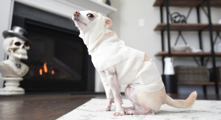 It doesn’t get much easier than this. All you’ll need is some medical wrap that sticks to itself, and, when you’re ready to dress your pup in their costume, gently wrap it around them!