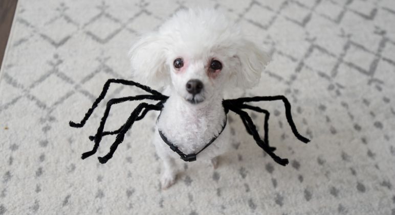 This is actually my costume this year! I purchased a spider web poncho for myself and I’ll be dressing my dogs in spider costumes. I was originally planning to buy their costumes, but, after adding them to my Amazon cart, I decided to make them myself instead. This costume takes about 5 minutes to throw together and – if you like to craft – you may already have the supplies.