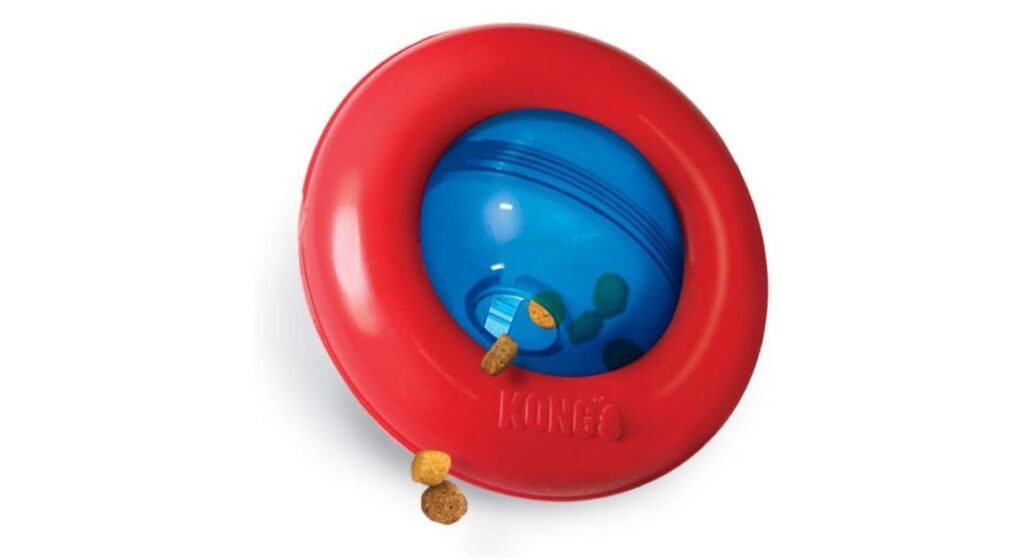 The KONG Gyro is another favorite in our house. My dogs have been playing with this toy for years and still get excited when they see me pull it out for them. It features a hard plastic piece that surrounds a spinning treat-filled ball. Once you stuff treats inside, just put it down on the ground and watch your dog bat it around with his paw and snout!