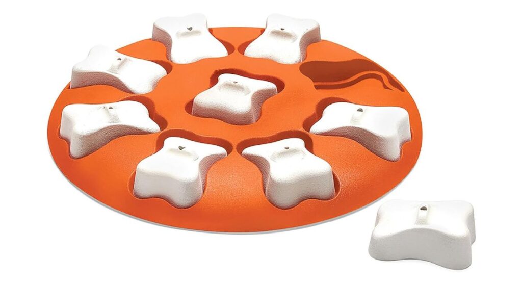 If your dog has never played with a puzzle before, this is a great place to start. It features 9 hidden treat compartments that are covered by 9 removable dog bone pieces. Hide your pup’s favorite treats underneath and then watch as your dog learns to nudge/paw his way to the reward!