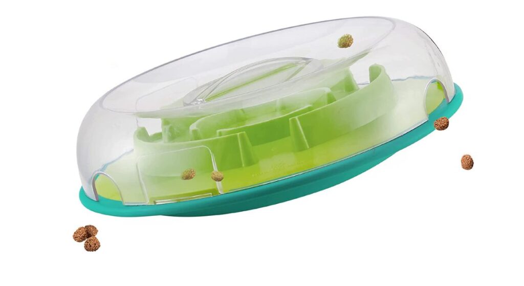 The goal here is simple: Your dog has to use his paws or snout to wobble the bowl. This movement prompts yummy treats/kibble bits to move through the internal maze pattern and eventually fall onto the floor. Prepping this puzzle for playtime is also easy peasy. Remove the lid’s plug, pour in the food, and then place the plug back into the lid. Voila – let the games begin!