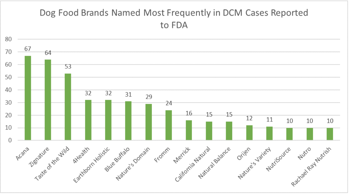 While the investigation continues, the FDA recently released the following graphic. It highlights the 16 dog food brands named most frequently in DCM cases reported to the FDA. Please note, this graph doesn’t include the complete list of reported foods. You can find more details here.