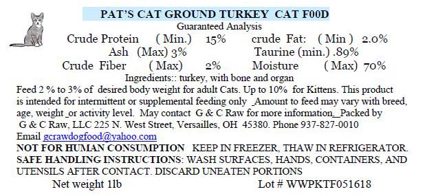 - 1 lb clear containers of Pat’s Cat Turkey with the Lot #WWPKTF051618