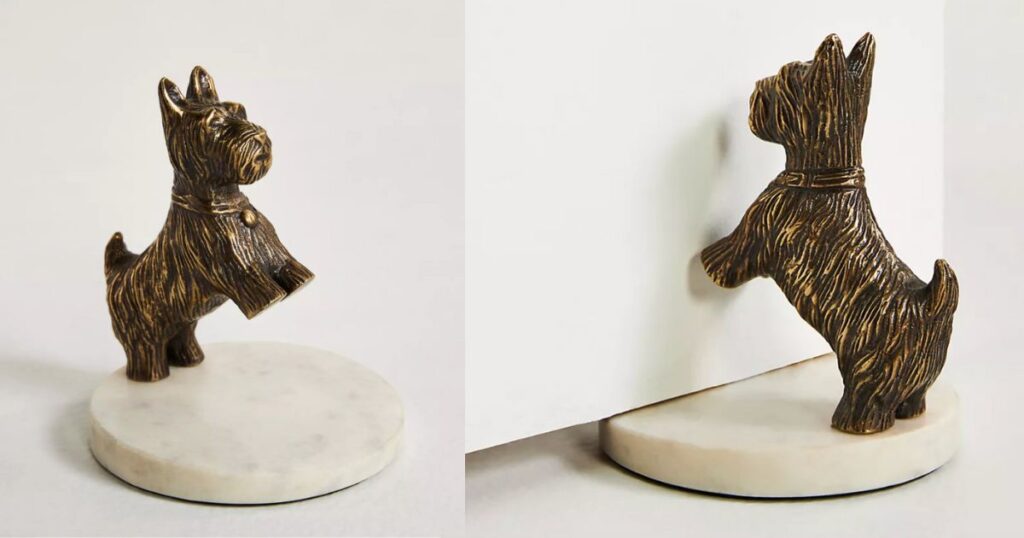 Here’s another fun idea for a dog lover’s home! Add a touch of charm to any door with the Scottie Doorstop from Anthropologie. This functional yet adorable piece is perfect for dog lovers who enjoy blending practical items with playful decor. Shaped like a sweet Scottie dog, it’s sturdy enough to hold doors open (made of aluminum and marble) while bringing a whimsical accent to any room!