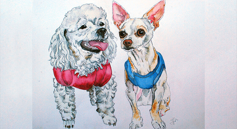 There are two main things that really make us dog parents smile from ear to ear. Know what they are? Our dogs and photos of our dogs! So, naturally, when I was digitally introduced to Sarah Miller, a talented painter and founder of sarahpaintspets, I couldn’t wait for her to create a custom pet portrait of my two canine kids—Diego and Gigi. Well, my watercolor painting just arrived in the mail and I’m honestly blown away.